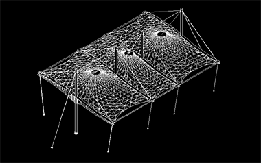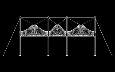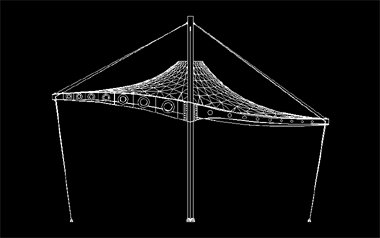 该膜结构工程投影面积约400平米,膜材是用MS-04型膜材,为骨架式膜结构。全套图纸包括钢结构图、膜节点板图、膜材下料图及排版图。