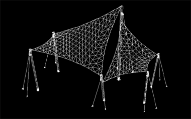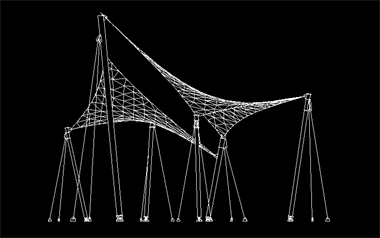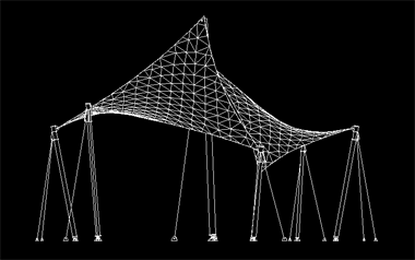 该膜结构工程投影面积约50平米,膜材采用MS-05型膜材,为张拉式膜结构。全套图纸包括基础图、预埋件图、钢结构图、膜节点板图、膜材下料图及排版图。