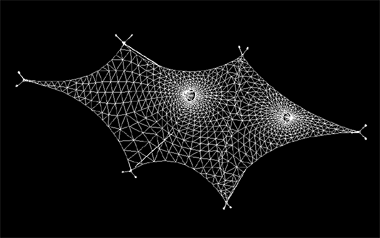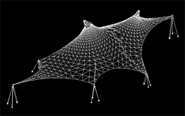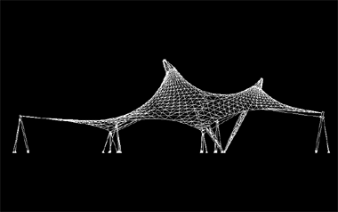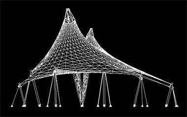 该膜结构工程投影面积400平米,膜展开面积500平米,中间为两根格构柱顶起两个帽口。全套图纸包括预埋件图、钢结构图、膜节点板图、膜材下料及排版图。