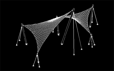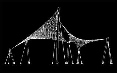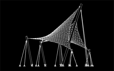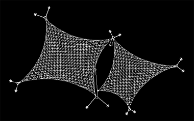 该膜结构工程投影面积约28平米,膜材是用法拉利膜材,整体造型轻盈,犹如两只小鸟在空中飞翔。全套图纸包括钢结构图、膜节点板图、膜材下料图。