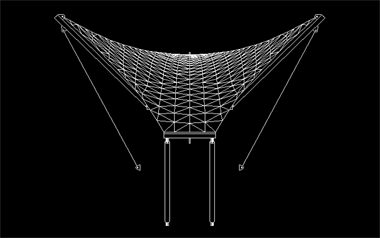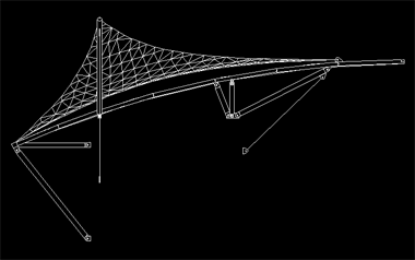 该膜结构工程投影面积约30平米,膜材采用秀博膜材,整体造型象一架飞机。全套图纸包括钢结构图、膜节点板图、膜材下料图及排版图。
